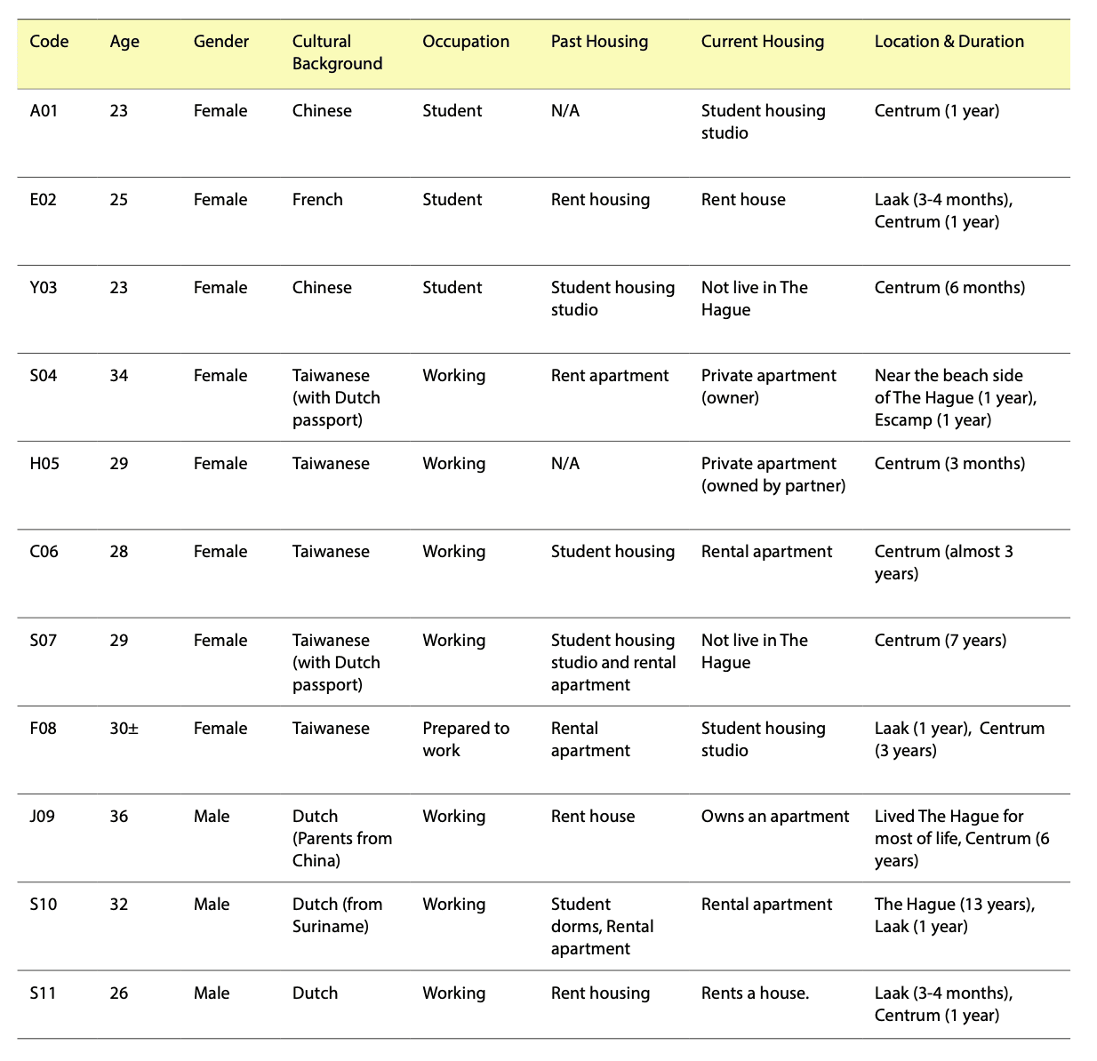The project interviewed 11 residents who have lived in The Hague, including 8 females and 3 males.