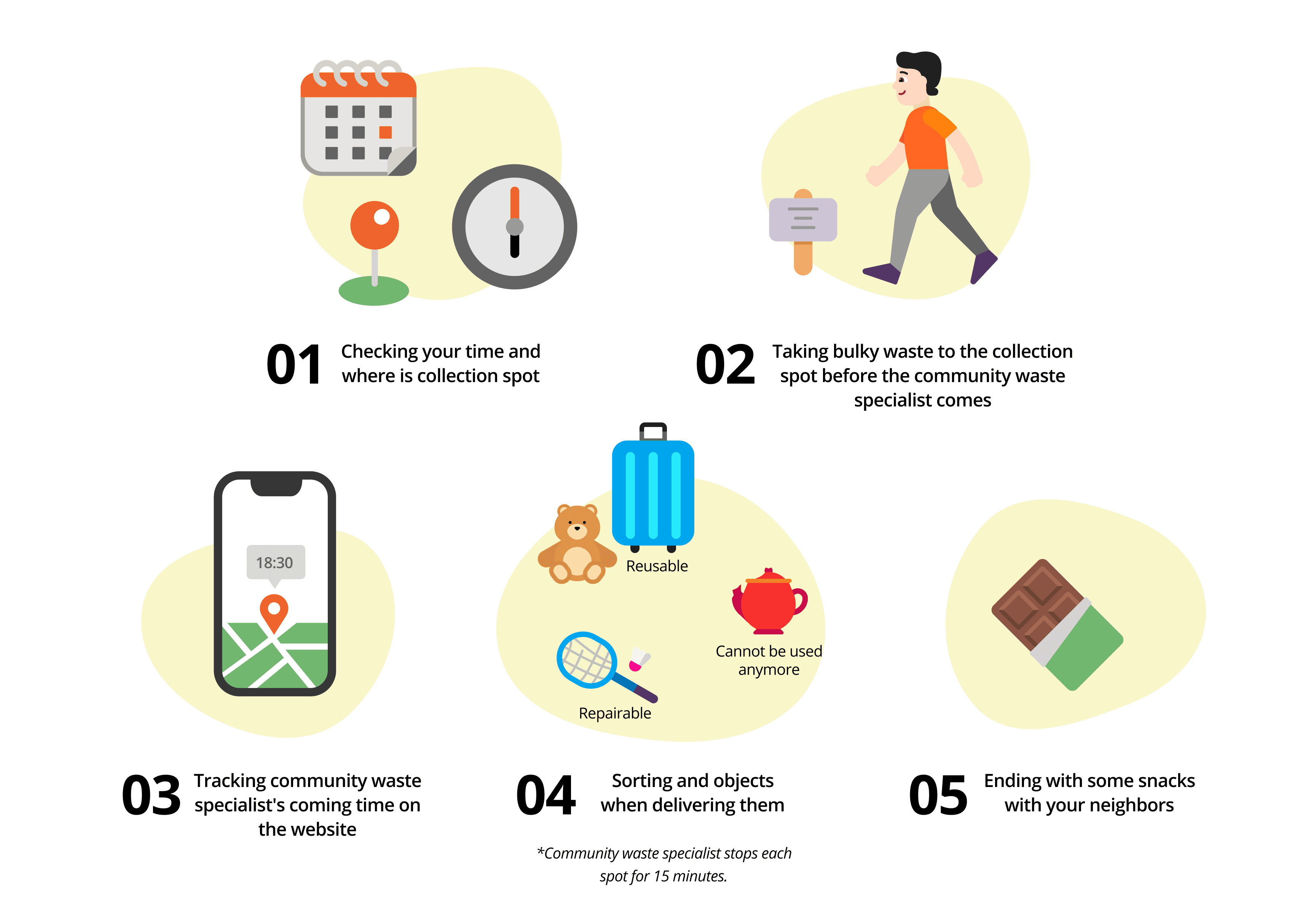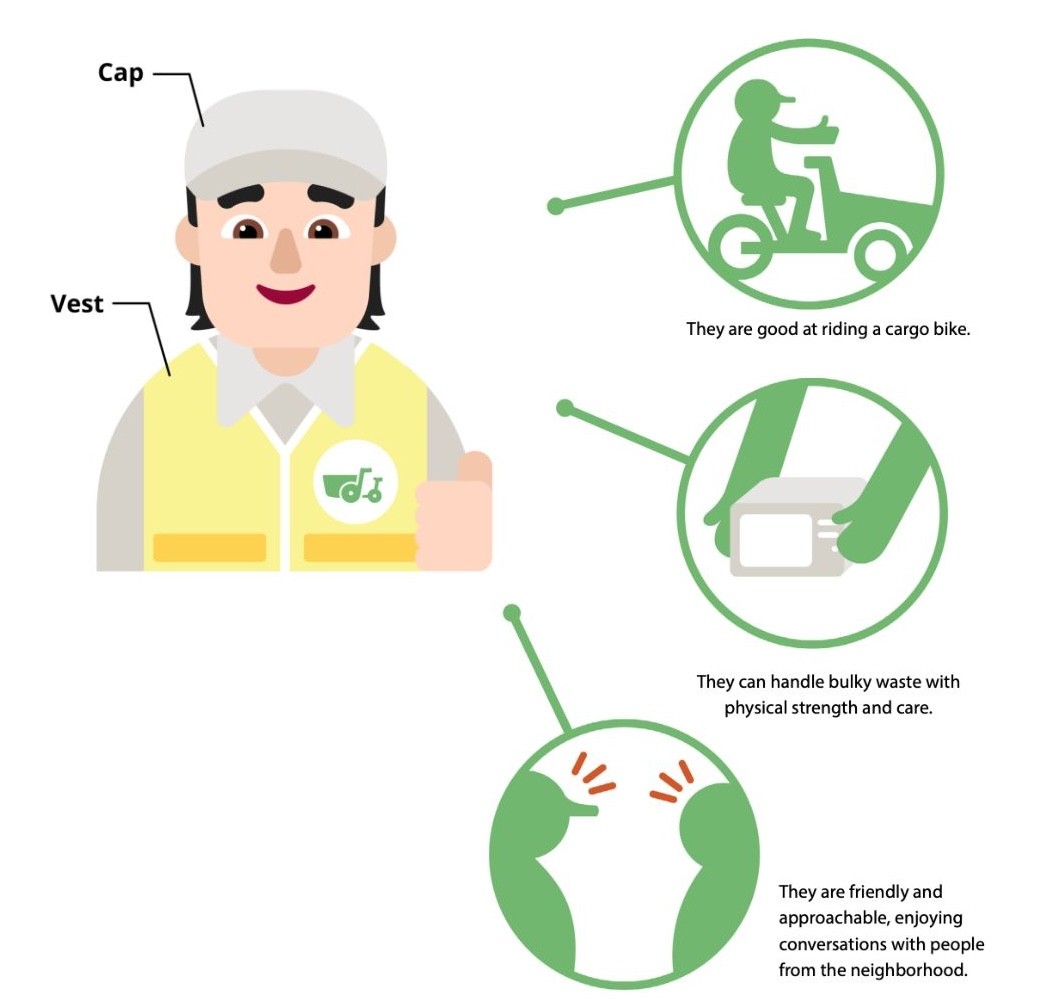 On weekends, a community waste specialist rides around the neighborhood on a bakfiets (cargo bike), playing the famous music "Oh-Oh Den Haag" to notify residents of its arrival. The community waste specialists will stop by and help residents sort their waste by card and stickers to mark the status of objects.