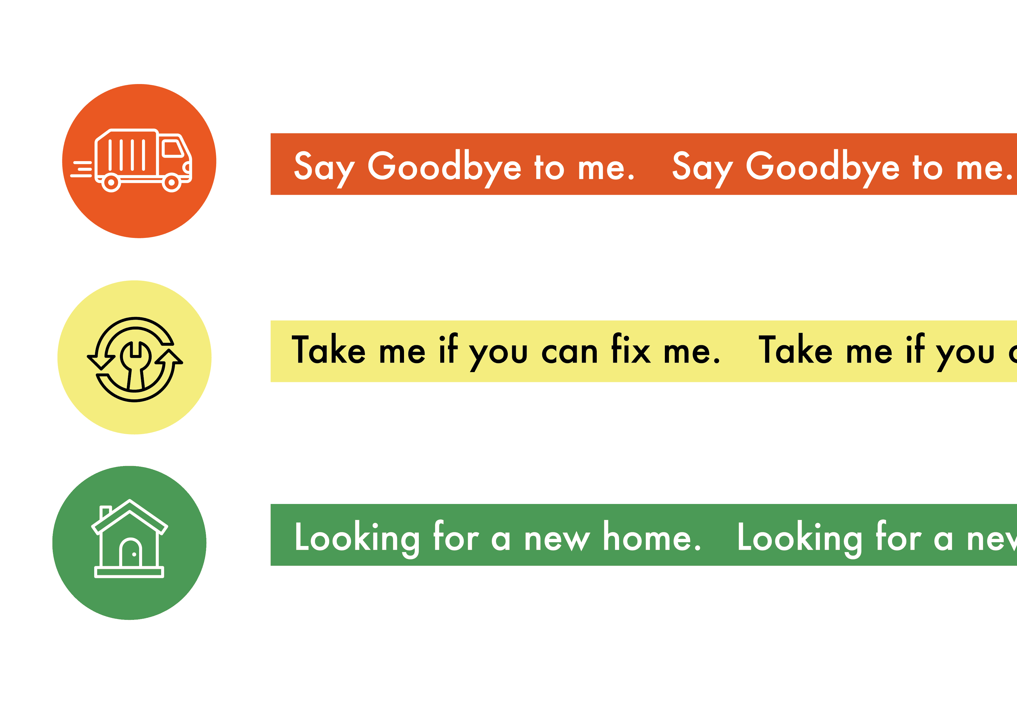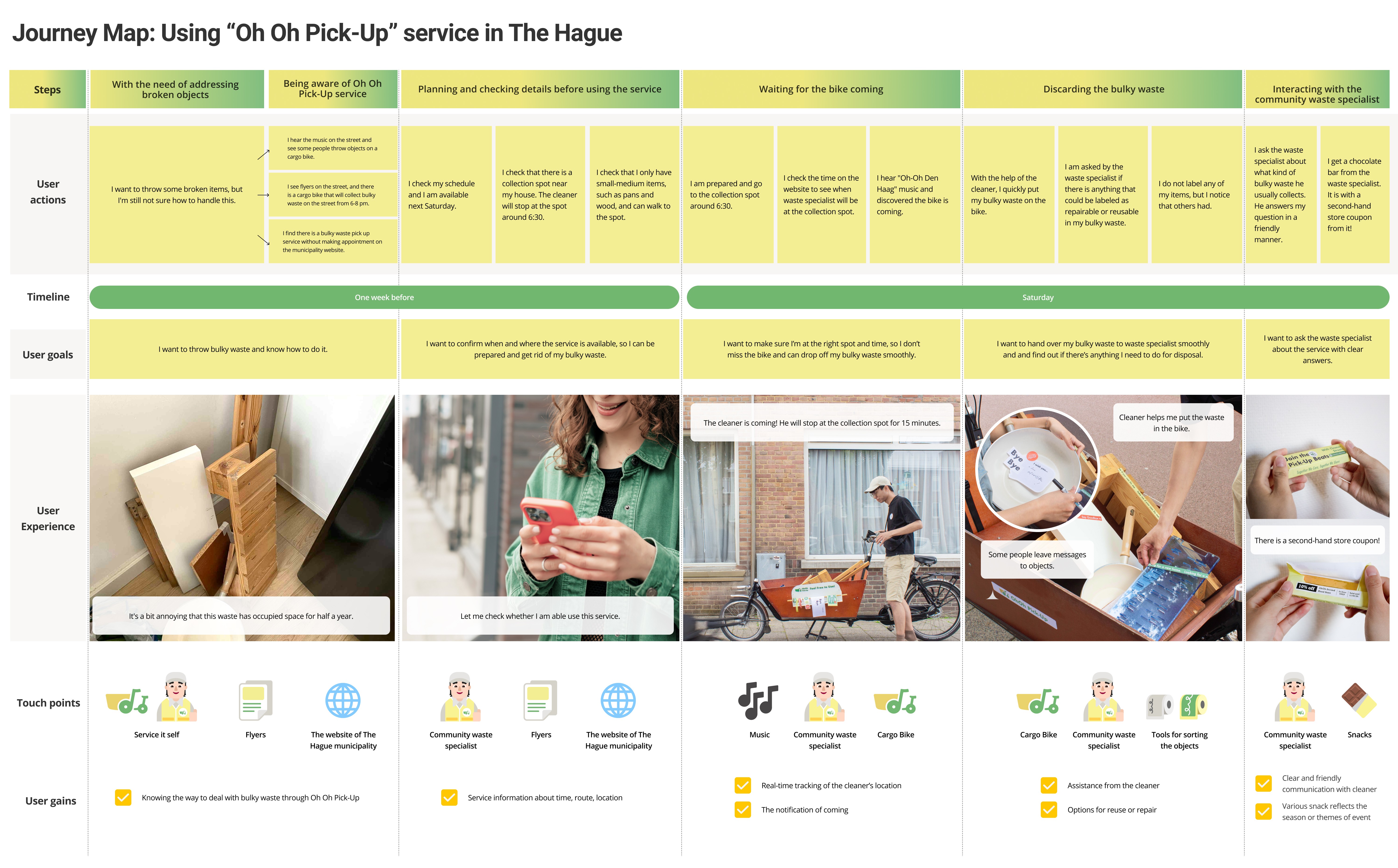 The overall graduation project aims to mitigate the misplacement of bulky waste around underground waste containers in The Hague. The project proposes the "Oh Oh Pick-Up", a mobile bulky waste pick-up service provided by the municipality. The Hague citizens can dispose of bulky objects/ waste without an appointment, taking items to the designated collection spot and time. Community waste specialists will take items by cargo bike and notify residents that they are coming with music.