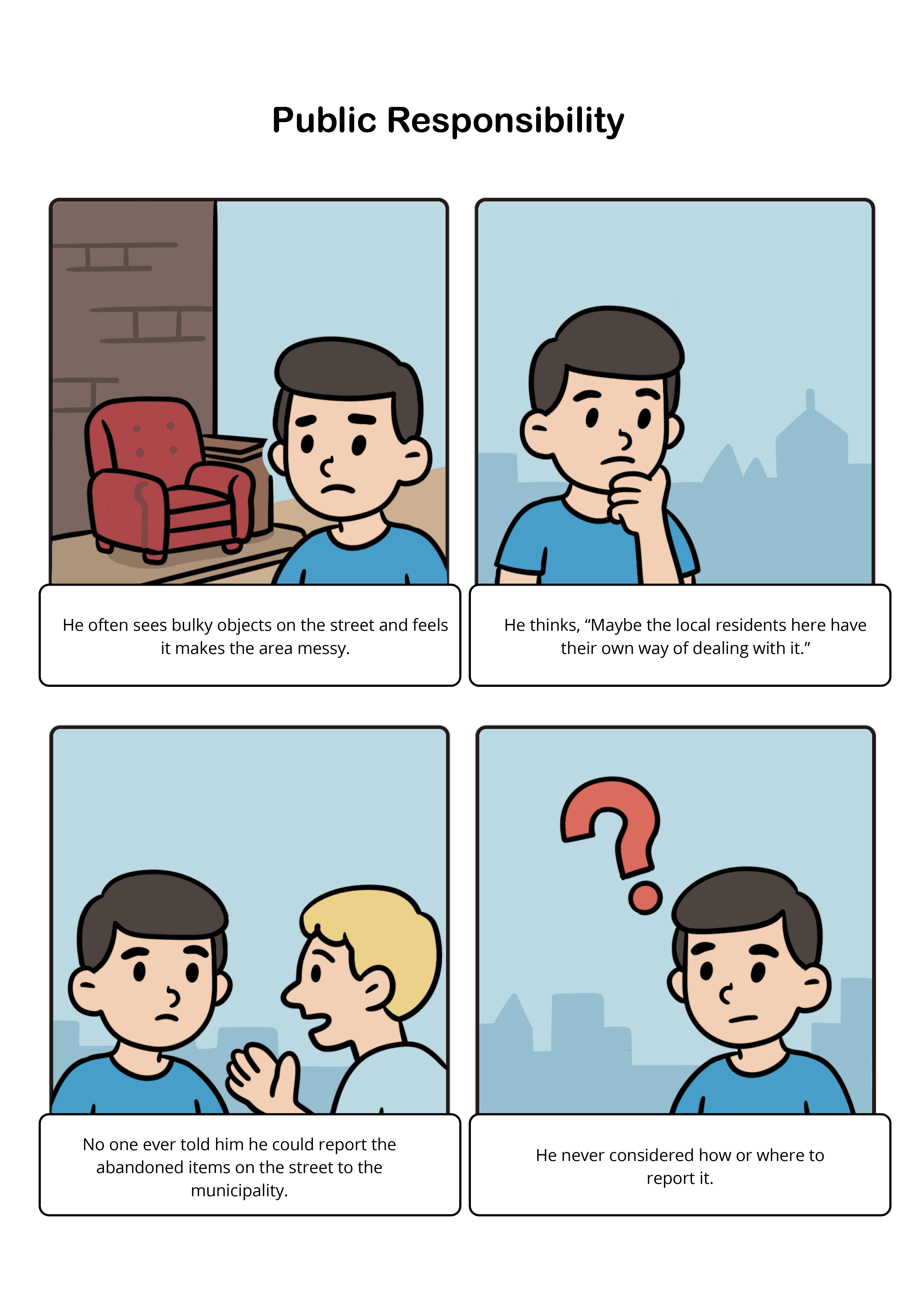 The anonymity of bulky waste disposal in public spaces reduces people’s sense of personal responsibility (A.4 Anonymousness in discarding waste).