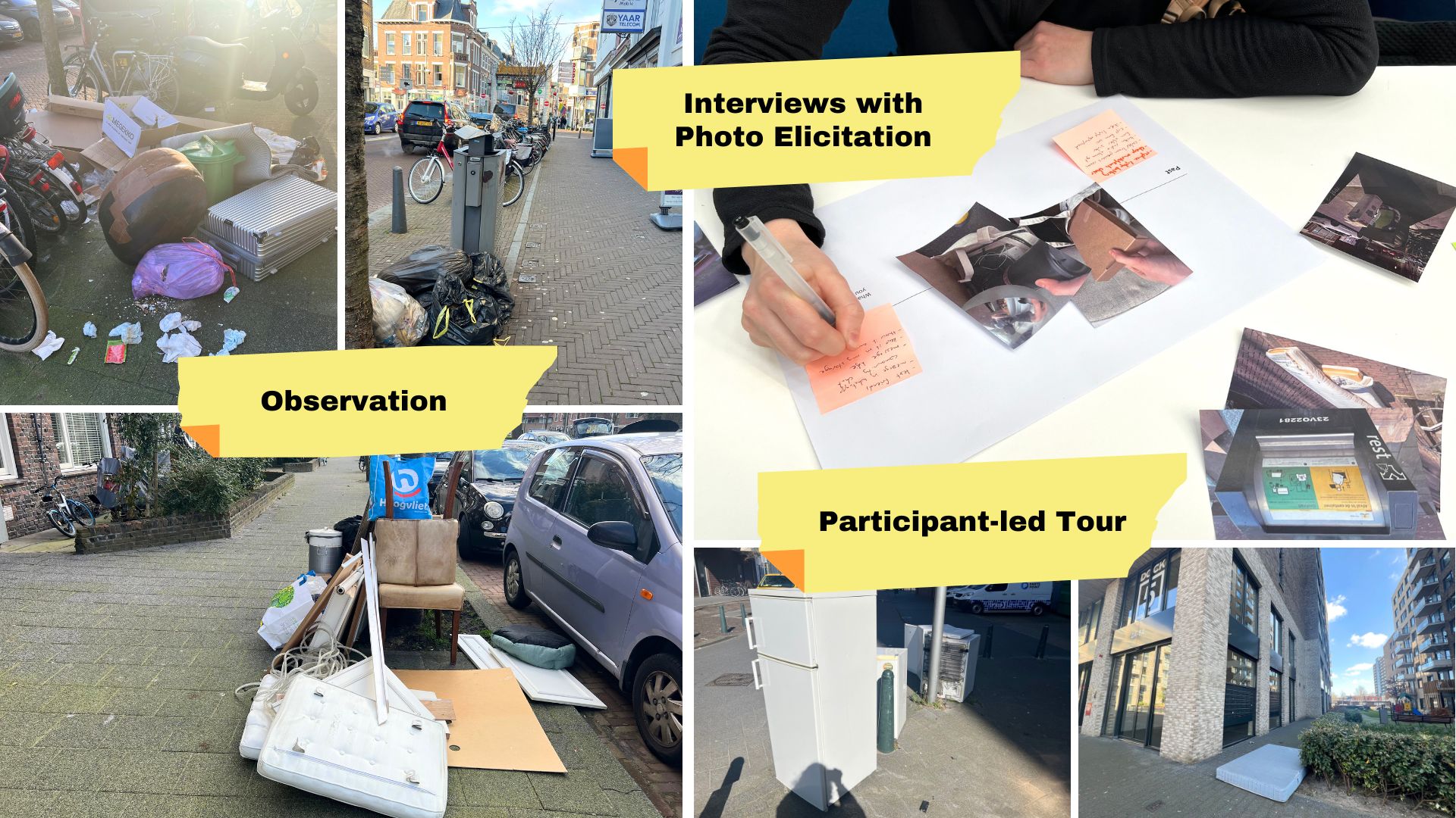 The researcher followed three participants to their neighborhood after interviews, which assisted in directly observing the actual living environment and bulky waste on the street. The research visited the Centrum district twice and once in the Laak district.