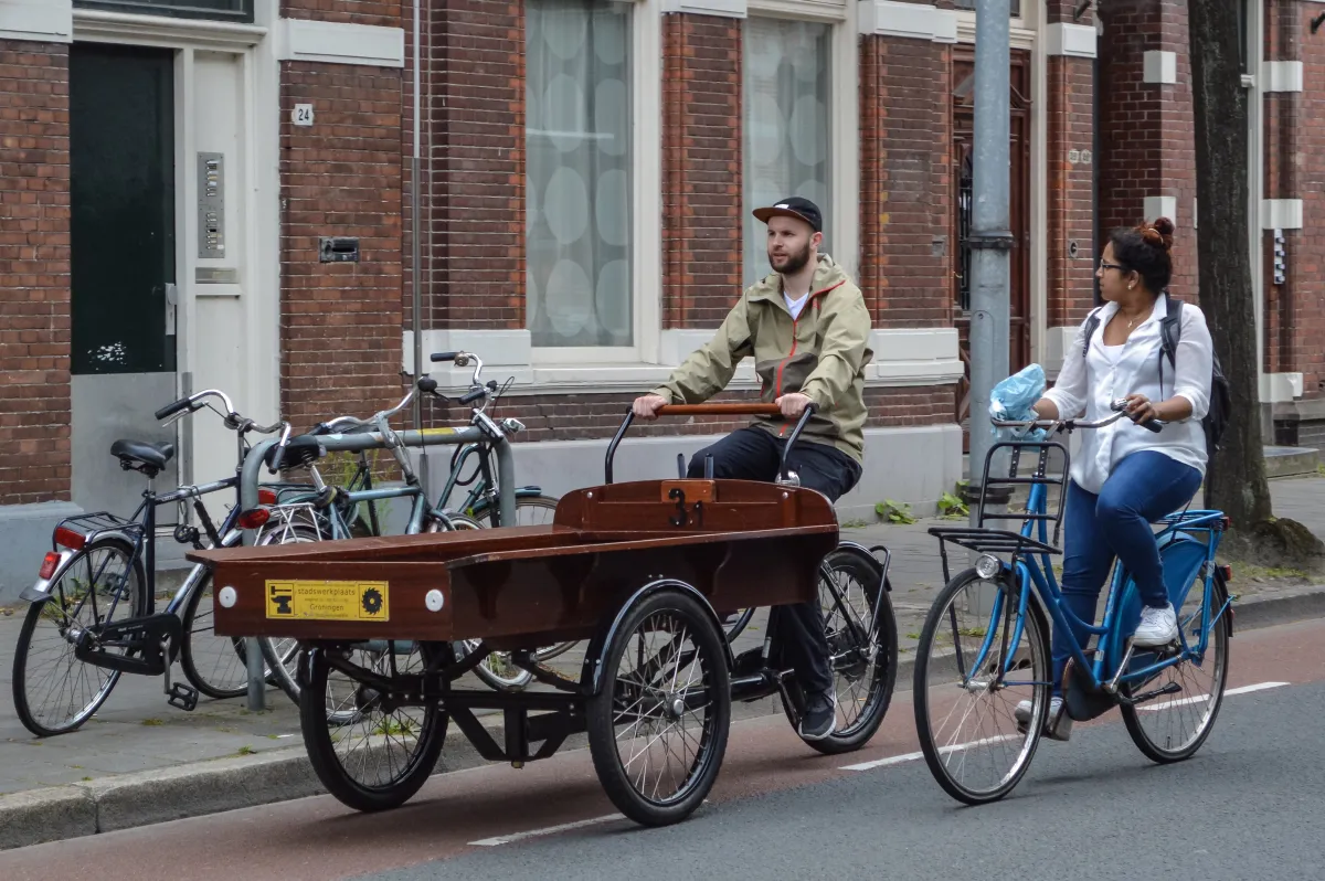 The current concept uses a small cargo bike designed for children, but a larger electric version, like the one from Stadswerkplaats in Groningen, would be more suitable. It can carry up to 250 kg, making it ideal for bulky waste collection.